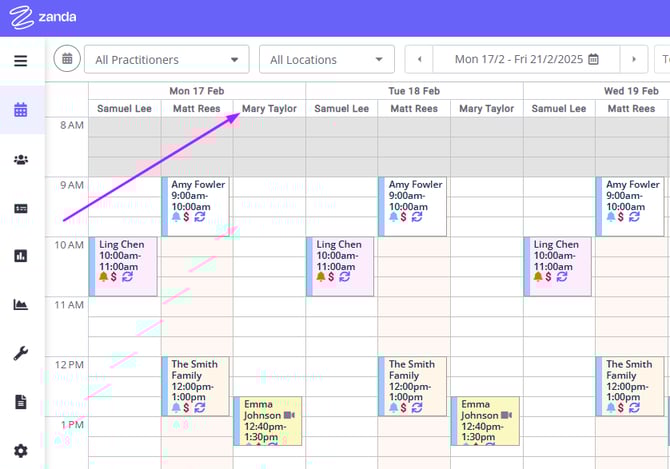 1. Open one practitioner calendar via the Practitioners filter, or by clicking their calendar name: