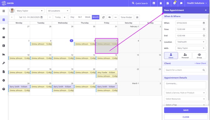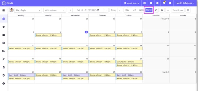 Utilize the monthly calendar View in Zanda to create, view, and edit appointments easily for one practitioner.