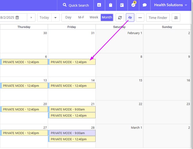 - Like other modes, you can switch to the Private Mode to hide the personal client information. Click on the Private Mode icon in the Calendar toolbar: