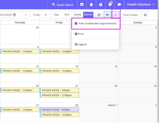- You can hide unattended appointments (rescheduled, cancelled, late cancellation, no show) to declutter the view. Click the three dots button and select 'Hide Unattended Appointments'. These appointments will be invisible on the Calendar, but will not be deleted.