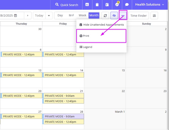 - If you select 'Print' from the three dots menu, you will be able to print or download a list of all appointments scheduled that month: