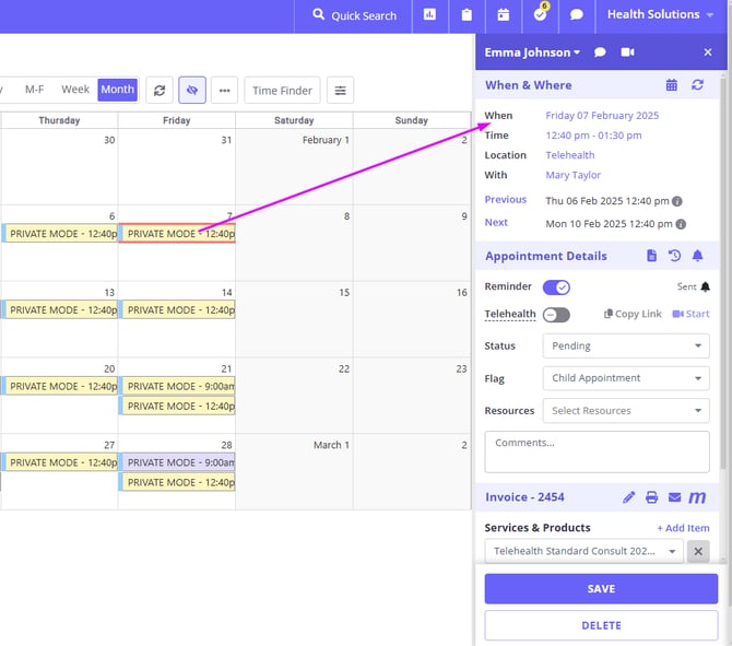- Left-click on an appointment block to open the Appointment panel and make any necessary edits. Save the changes.