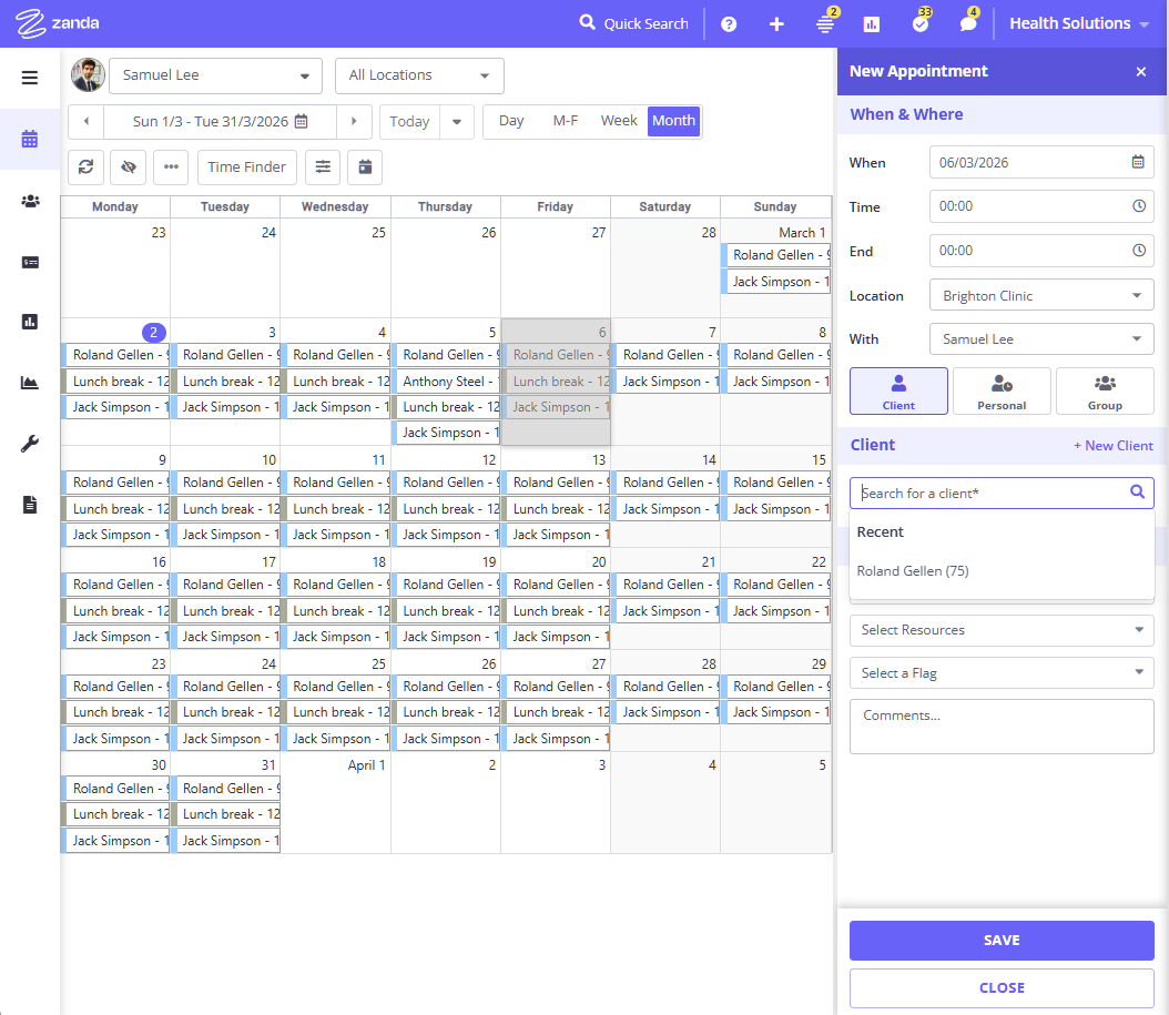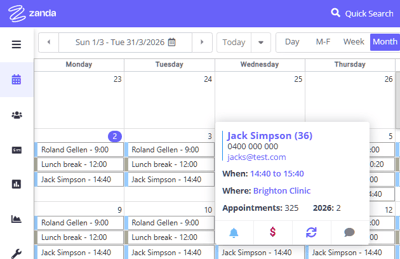 Use the monthly calendar view in Zanda to create, view, and edit appointments easily for one practitioner.