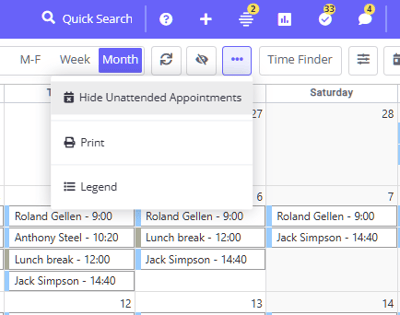 - You can hide unattended appointments (rescheduled, cancelled, late cancellation, no show) to declutter the view. Click the three dots button and select 'Hide Unattended Appointments'. These appointments will be invisible on the Calendar, but will not be deleted.