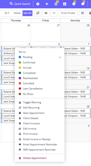 - Right-click on an appointment block to open its context menu. Select one of the available actions to implement them to this appointment.