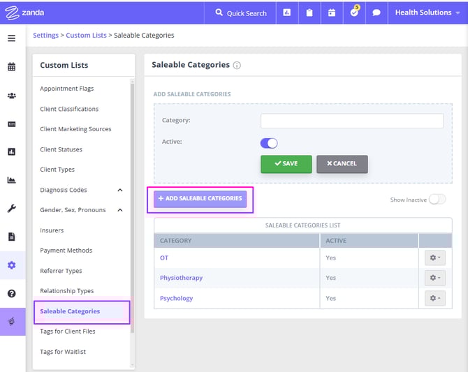 - Navigate to Settings > Billing > Saleable Categories and click on Add Saleable Categories