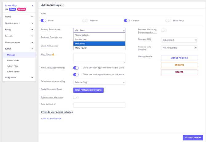 If another practitioner takes over the clients of the leaving practitioner, make sure that you update the Primary Practitioner setting of these Clients' Profiles.