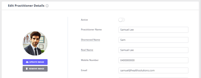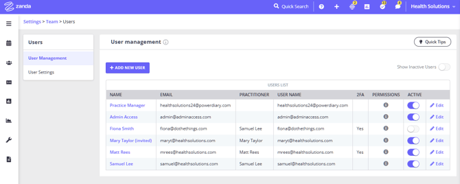 - On the left-side menu of Zanda, navigate to User Menu > Account Settings > Team > Practitioners, open the practitioner and disable the Active switch at the top-right corner of the page.