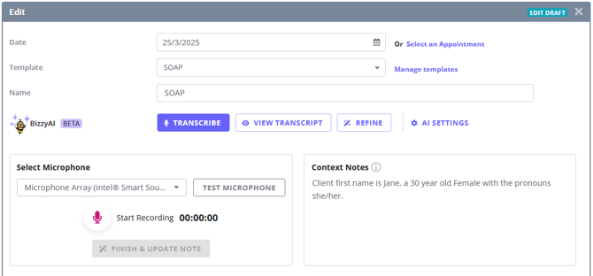 The Scribe functionality allows you to transcribe client sessions, picking up the full conversation and converting it into text to produce a summarized note of the session. Using BizzyAI: Refine, you can request BizzyAI to rewrite or reformat your note.