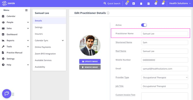 - What gets updated: Zanda updates the "First Name" field of your Zoom user profile with the name entered in the 'Practitioner Name' field in Zanda.