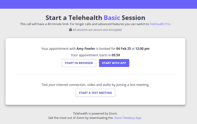 Clients will need to click the Telehealth session link they received from you, to open a session. The client's experience will be the same regardless of the Zoom Telehealth subscription their practitioner is using in their Zanda account.